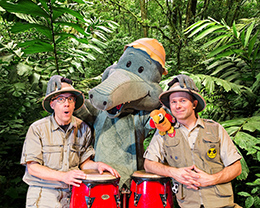 Arne Alligator & Djungeltrumman består av två safariklädda herrar: Tomas Nyberg, Macke Granberg och Arne Alligator. De skriver låtarna själva och producerar dem i Mackes Alligator-studio. På scenen gör Arne Alligator & Djungeltrumman en intensiv och humoristisk show där Tomas sjunger, Macke rockar på gitarren och Arne Alligator hittar på hyss och spelar på sina röda kongas. Ibland spökar det på scenen. Ibland så ryker det ur skorsten så man måste ringa Torsten med Borsten. Ibland pratar de bara strunt. På konserterna får man alltid sjunga med, klappa och dansa. Orkestern uppträder i tre- eller sexpersoners uppsättning.